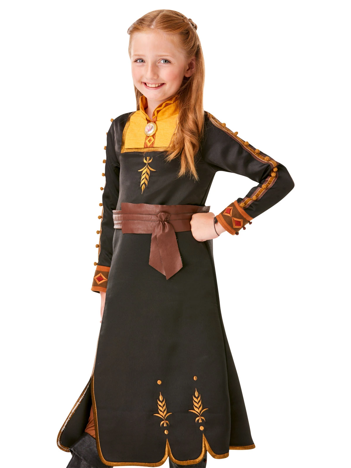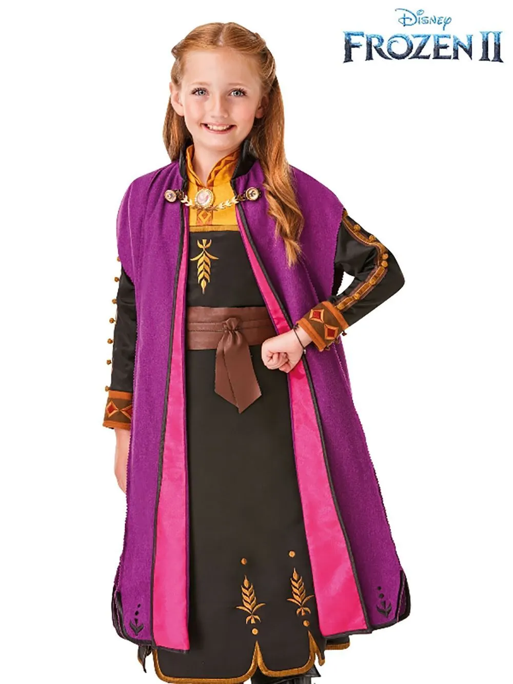 Available Online. For instore availability please call us on 07 3279 1555 Â “Do you want to build a snowman?” She is Anna, from the blockbuster Disney movies Frozen (2013), short films Frozen Fever (2015) and Olaf’s Frozen Adventures (2017) and now the NEW movie, Frozen 2 (2019). Featuring actor Kristen Bell, journey to Arendelle with your sister Elsa and friends Olaf, Kristoff and Sven. Together, you find the strength to reverse the curse that has plunged the kingdom into an eternal winter. Become the brave, stubborn but beautiful Anna and see what adventures you travel to in Frozen 2.INCLUDESCrepe satin dress with folkloric embroidery detail and separate belt, plus a mock shirt and collar with embroidery and 3D icon gem broochDress has embroidered suedette cuffs with satin covered buttonsWoolly, luxurious two-tone cloak with shimmer satin lapel plus collar with cape fastening and embossed buttonsJersey pants in legging style with textured detailsCertificate of authenticity with ‘official’ holographic sticker and silver foil print inside a deluxe velour pouch. This is a numbered limited-edition pieceCostume is packaged in a deluxe suit carrier with official swing tag and pants are packaged in a separate organza bag with silver ribbonBoots not includedThis is an officially licensed Disney product
