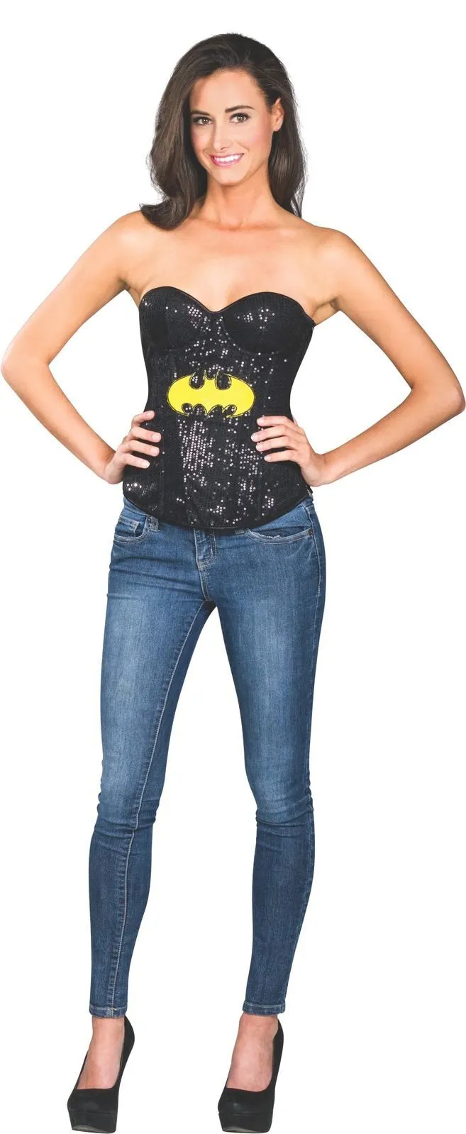 Available Online. For instore availability please call us on 07 3279 1555 Â One of the most famous DC Comics superheroines, Batgirl, also known as Barbara Gordon is the daughter of Chief Commissioner Gordon. She stars in comics, movies, TV series and also as one of the DC Superhero Girls. A female version of the famous Batman, Batgirl uses her batarangs and bat-cycle to help fight crime and clean up the streets of Gotham City.INCLUDESCorset in sequin fabric with sweetheart necklineBat emblem attached to frontThis is an officially licensed DC Comics product
