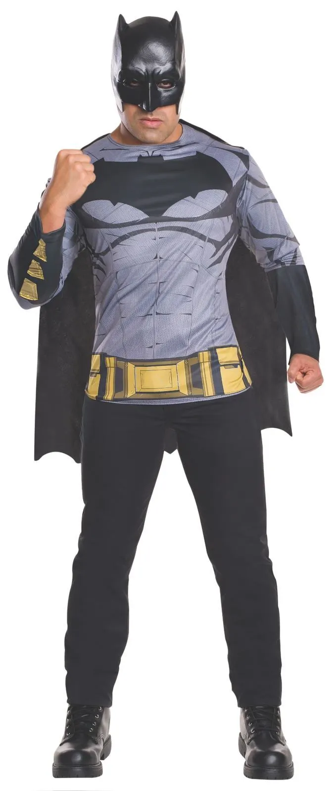Available Online. For instore availability please call us on 07 3279 1555 Â He is arguably the most famous character in DC Comics – he is the ultimate Batman. By day he is the eccentric Gotham City tycoon Bruce Wayne, but by night Batman is the fearless Gotham City Crimefighter. This classic superhero uses his batarangs, bat cycle and batmobiles to out-smart the likes of The Riddler, The Penguin and The Joker. Played by Actor Ben Affleck he is the star of Warner Bros blockbuster films Batman Vs Superman: Dawn of Justice (2016), Suicide Squad (2016) and Justice League (2017). As much-loved today as ever – become The Batman today! INCLUDES Top with digitally printed bodice Full-length sleeves with digital print Detachable cape in polyester with scalloped hem and velcro fastens at shoulders Moulded mask with elastic strap and velcro fasten This is an officially licensed DC Comics product