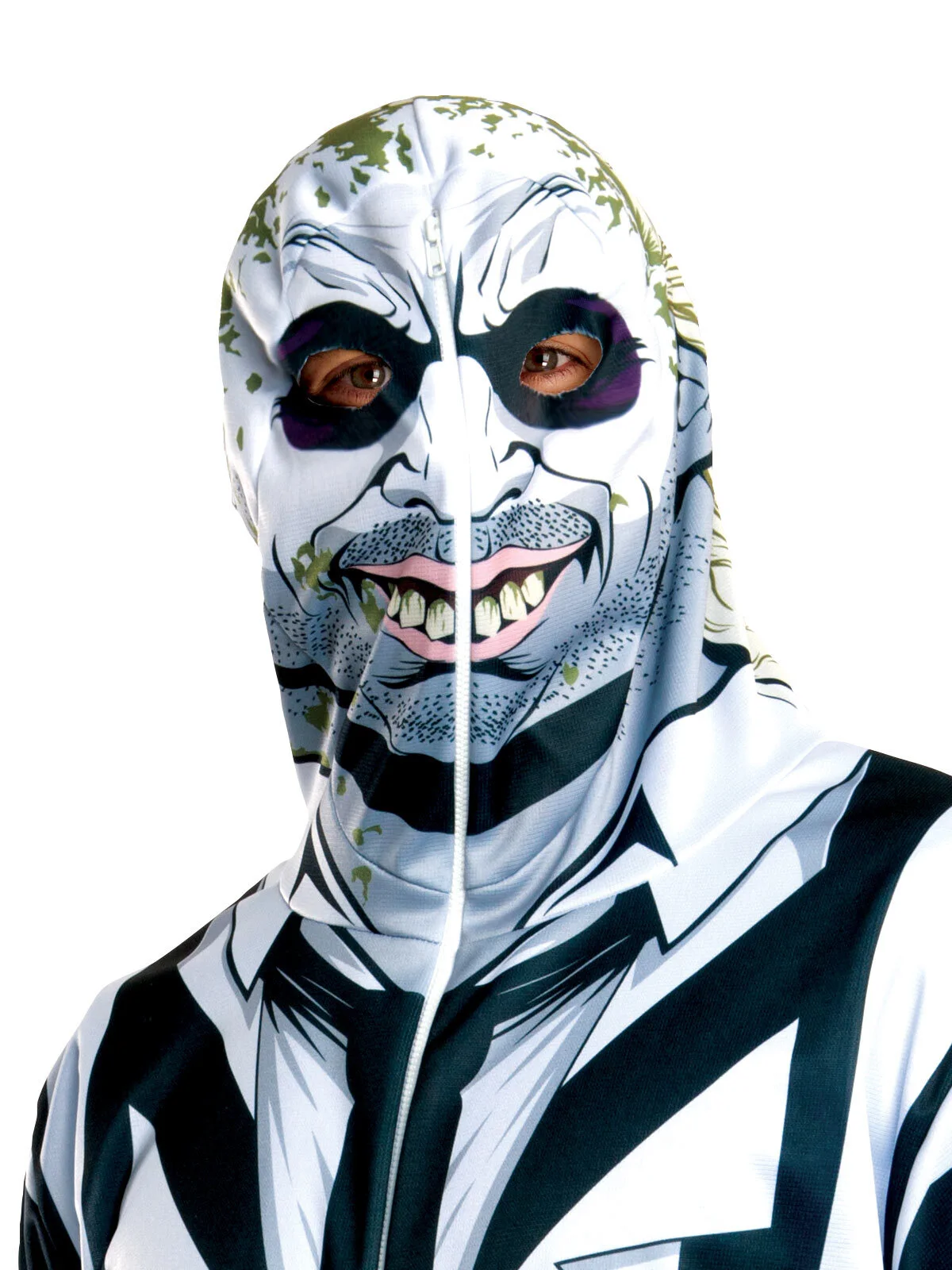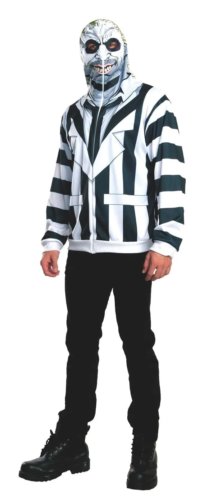 Available Online. For instore availability please call us on 07 3279 1555 Â Beware – if you say Beetlejuice three times he appears! A Tim Burton classic spooky, comedy film from 1988, Beetlejuice makes us jump and jeer at the same time. “Betelgeuse”, played by Michael Keaton tries to ward off the ghosts of Barbara Maitland, (Geena Davis) and Adam Maitland, (Alec Baldwin) from their own home as well as the new residents, an unsuspecting family from New York. A ghost from the Neverland, Beetlejuice haunts, taunts and terrorises in his trademark black and white striped suit with wild grey hair and a painted ghostly face. Try on some magic this Halloween as you “turn on the juice and see what comes loose!”INCLUDESHooded jumper with zip front from hem to top of hoodFull length sleevesDigitally printed details including iconic stripes, shirt front with tie, facial features and hairThis is an officially licensed Beetlejuice product