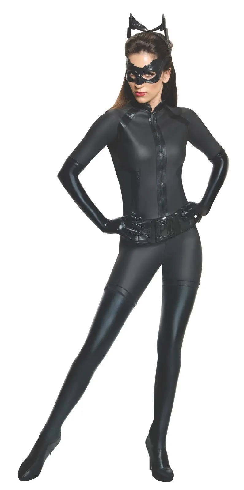 Available Online. For instore availability please call us on 07 3279 1555 Â Her character started as “The Cat” in the 1940 “Batman” movie. A sleek, slinky, sexy DC Comics character, Catwoman is the complicated love interest of Batman and a villainous cat burglar, prowling around Gotham City. In later years she has become an anti-heroine, often doing wrong things for the right reasons. Selina Kyle is known for her figure-hugging black catsuit, pointy ears and her bullwhip weapon. Played by many famous actors over the decades, including Michelle Pfeiffer and Anne Hathaway, Catwoman has starred in many films by Warner Bros such as The Dark Knight (2012) and Batman Returns (1992). So, practice your meow and your purr, and become this feisty feline. INCLUDES Jumpsuit with printed details on the bodice full length sleeves with a wet look panel to the cuff with a jagged hem Pants with digital print Moulded mask with shaped eye cut outs, 3D ears and painted features This is an officially licensed DC Comics product