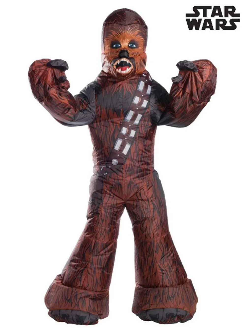 Available Online. For instore availability please call us on 07 3279 1555 Â He is everyone’s favourite hairy Wookie. The walking carpet of the outer galaxy, Chewbacca, often called “Chewie” is co-pilot to Han Solo on his spaceship The Millennium Falcon. Together Chewie and his friends in The Resistance fight against the Dark side in Disney/Lucas Films’ infamous Star Wars series. See him in A New Hope (1977), The Empire Strikes Back (1980), Return of the Jedi (1983), Revenge of the Sith (2005), The Clone Wars (2008), The Force Awakens (2015), Rogue One (2016) and The Last Jedi (2017). INCLUDES Inflatable jumpsuit with digital print including fur and bandolier with pouch Enclosed oversized feet and hands Headpiece with one way vision panel for sight Battery operated fan takes 4 ‘ AA’ batteries, not included This is an officially licensed Star Wars product