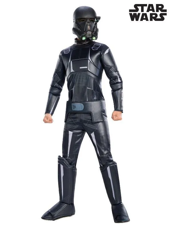 Available Online. For instore availability please call us on 07 3279 1555 Variants of the Stormtrooper, the Death Troopers were trained in army combat, heavy weapons & sniping. In Lucas Films’ Star Wars series, these fighters wore black body armour suits and Helmets and were villains of the dark side. INCLUDES Jumpsuit with digital print on bodice, padded chest with stitching detail, stand away collar and full length sleeves with digital print and padded armour Pants with digital print and attached 3D boot tops with padding Padded belt with digital print and fasten at back Moulded mask with painted features, mesh eye covers and elastic strap This is an officially licensed Star Wars product