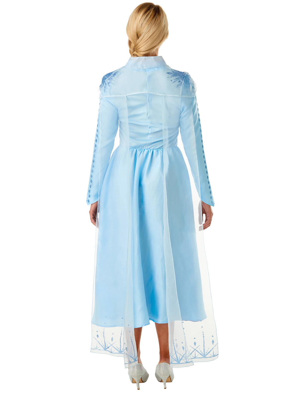 Available Online. For instore availability please call us on 07 3279 1555 Â “Let It Go!” She is Elsa from the blockbuster Disney movies Frozen (2013), short films Frozen Fever (2015) and Olaf’s Frozen Adventures (2017) and now the NEW movie, Frozen 2 (2019). Featuring actor and singer Idina Menzel, become the magical Queen Elsa as you journey to Arendelle with your sister Anna. With friends Olaf, Kristoff and Sven, together you find the strength and power to reverse the curse that has plunged you and your kingdom into an eternal winter. Take on the guise of Elsa – strong, protective and powerful, and see what adventures await you in Frozen 2.INCLUDESSatinique dress to mid-calf height in shades of blue with mauve highlights and printed mock belt at elasticised waistline, plus glitter diamond trim down the full length sleeves. Sleeves have pointed cuffsDress features elaborate neckline with a silvery sequin panel in the centre plus glitter snowflakes printed on the collarDigitally printed satin skirt displays a textured pattern in mauve and blue shades plus glittery printed embellishmentsDetachable digitally printed sheer cape features high collar plus a glittery snowflake design at top and hemline. Cape attaches with velcro tabs at the dress collar and drapes down to ankle height in two flowing sectionsShoes not includedThis is an officially licensed Disney product
