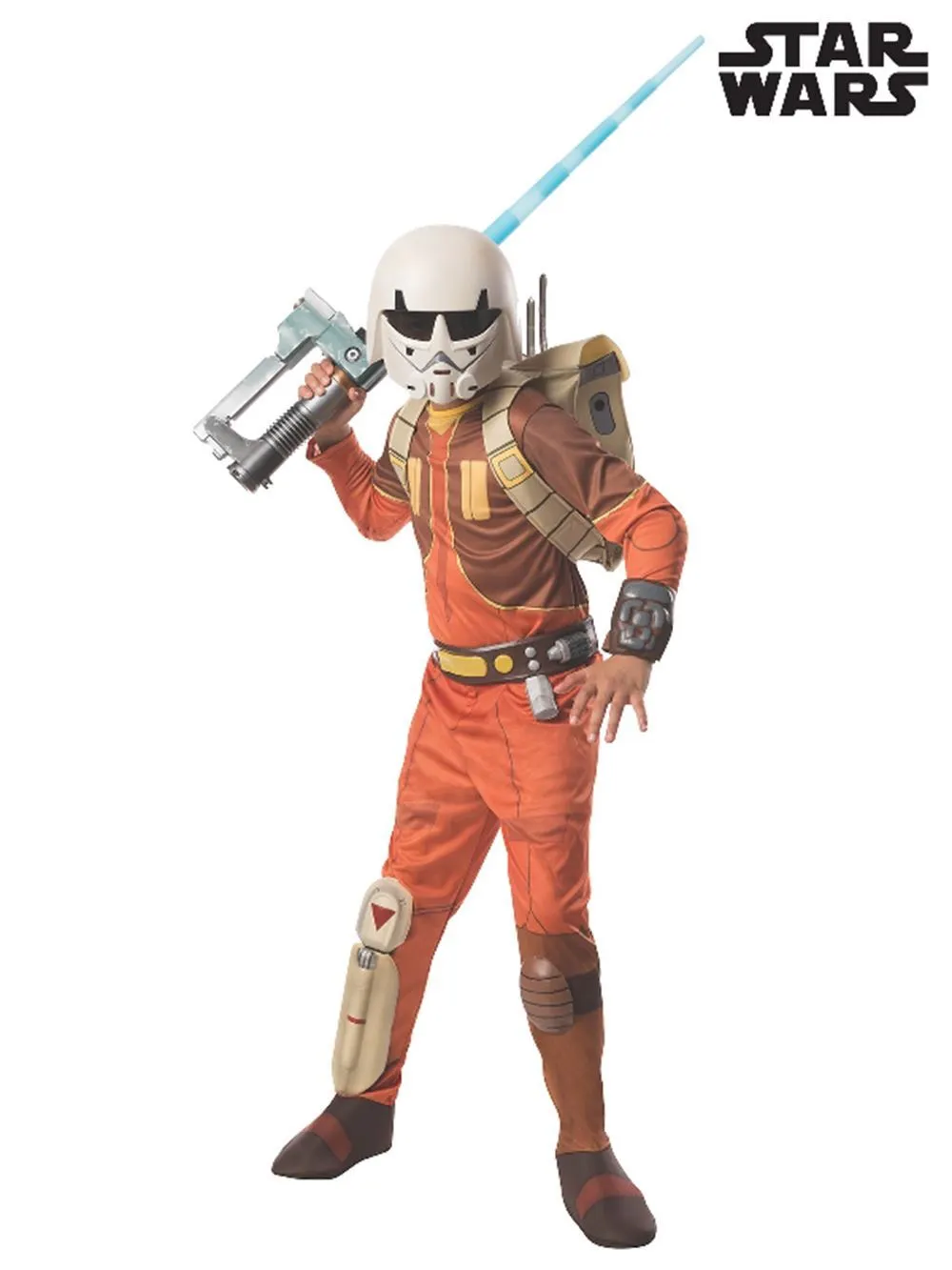 Available Online. For instore availability please call us on 07 3279 1555 Â From the Lucas Film series Star Wars, Ezra Bridger, code name Spectre 6 is a human in the Star Wars galaxy and a Jedi Padawan. Ezra trained under the Jedi Master Yoda and is known for his bright orange jumpsuit. Throughout his childhood, Ezra would occasionally trigger strange abilities, which allowed him to see into the future. At the time, Ezra didn’t know the true nature of these abilities, which, in truth, was the Force. See him in the Clone Series, the Rebels series, Lego Star Wars movies, Guardians of the Galaxy and TV, cartoon and gaming versions. INCLUDES Jumpsuit with digital print and full length sleeves plus attached boot tops and attached moulded armour pieces with painted details Moulded foam belt with painted details and fabric ties at back Back pack with printed details, foam backed shoulder straps and velcro fasten on flap Moulded mask with see through visor and elastic strap. Weapon not included This is an officially licensed Star Wars product