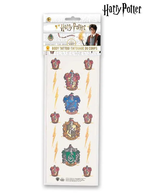 Available Online. For instore availability please call us on 07 3279 1555 Â Possibly the most well- known young Wizard of this century, Harry Potter is the magic behind the famous J K Rowling series. A student of Gryffindor House at the Hogwarts School of Witchcraft and Wizardry and under the instruction of Albus Dumbledore, Harry acquires the skills and magic to confront antagonist Lord Voldemort. Known for his robe, wand, glasses and lightning bolt scar, Harry is a favourite character for Book Week and Halloween. Also a popular movie series, Harry Potter is played by actor Daniel Radcliffe. Novels in this series include Harry Potter and the Philosopher’s Stone, Harry Potter and the Chamber of Secrets, Harry Potter and the Prisoner of Azkaban, Harry Potter and the Goblet of Fire, Harry Potter and the Order of the Phoenix, Harry Potter and the Half Blood Prince and Harry Potter and the Deathly Hallows. INCLUDES One Pack of Temporary Tattoos containing: All four House crests Hogwarts Emblems and Lightening Scar Motifs Tattoos are skin friendly and wash off with water This is an officially licensed Harry Potter product