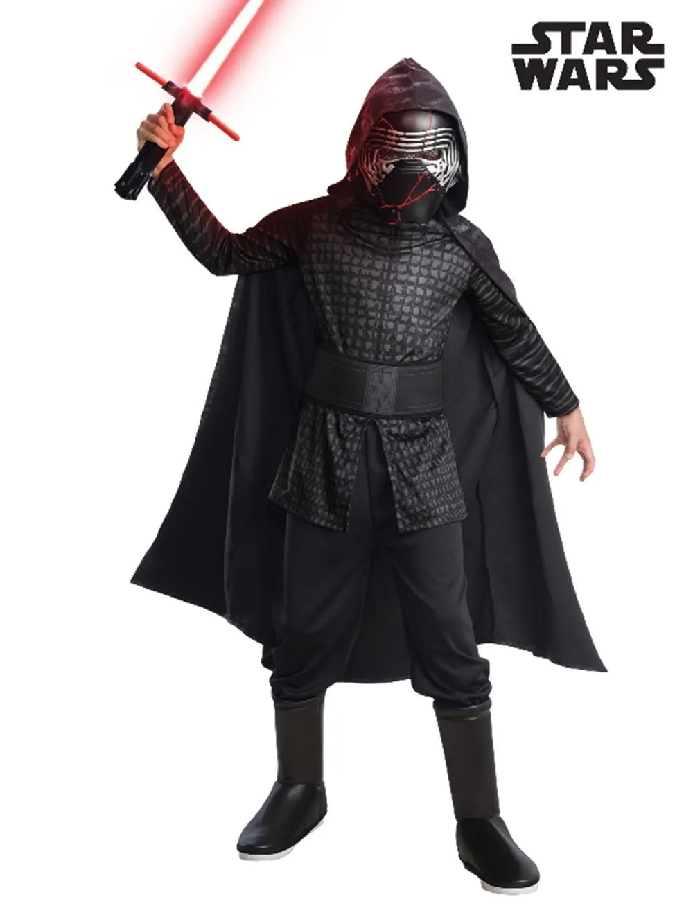Available Online. For instore availability please call us on 07 3279 1555 Â Kylo Ren is the chosen name of Ben Solo, son of Han and Princess Leia Organa and grandson of the great Darth Vader. Trained as a Jedi by Luke Skywalker, he was taken to the dark side by Supreme Leader Snoke in Disney/Lucas Film’s blockbuster Star Wars movies The Force Awakens (2015), The Last Jedi (2017) and the latest Star Wars movie The Rise of Skywalker (2019). Played by Actor Adam driver, Kylo is as dark on the inside as his black cloak and helmet. INCLUDES Digitally printed tunic in polyester with full length sleeves, high collar and a feature split in the front and rear. Separate foam backed printed belt has velcro tabs Velour-look textured cape has an attached hood and velcro tabs to fasten to the tunic shoulders Pants with elastic waist and attached leather-look boot covers with elastic to go under shoes Moulded EVA plastic mask with painted features, mesh cover over eyes and elastic strap with velcro fasten. Mask has red scars painted on it Light saber not included This is an officially licensed Star Wars product This is an officially licensed Star Wars product
