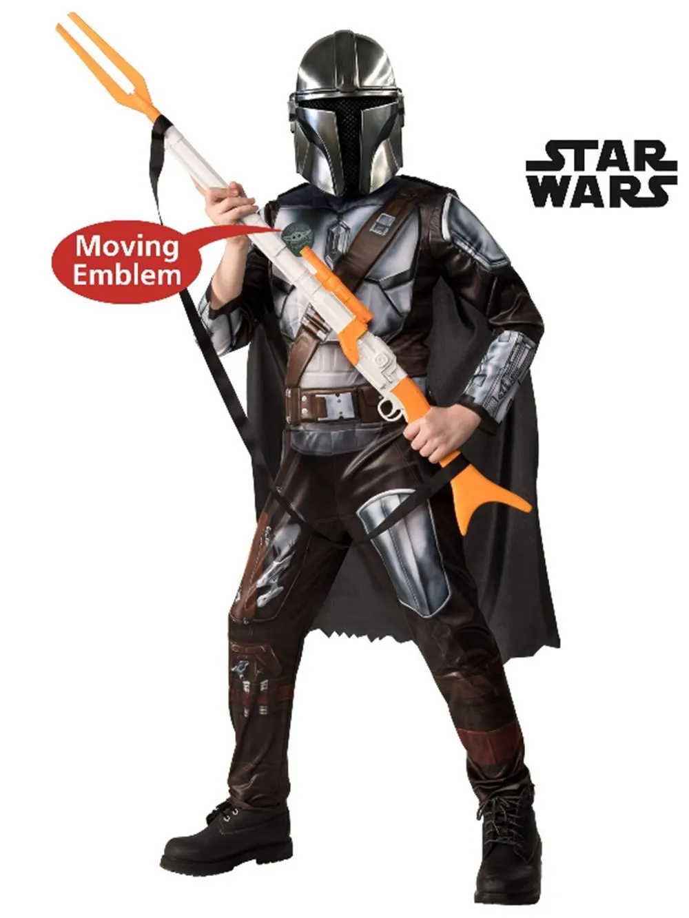 Available Online. For instore availability please call us on 07 3279 1555  Set five years after the events of Return of the Jedi and 25 years prior to the events of The Force Awakens, Disney+ released Star Wars: The Mandalorian as a live-action TV series in 2019. The story follows the title character, the Mandalorian bounty hunter Din Djarin, and his exploits beyond the reaches of the New Republic. Taking the world by storm, actor Pedro Pascal, also referred to as “Mando” was a foundling rescued by Mandalorians. “The Child” is a toddler at age 50 and is of the same unnamed species at powerful Jedi Master Yoda and needs to be delivered to “The Client” by the Mandalorian. INCLUDES  Digitally printed deluxe jumpsuit with printing on front and back and foam padded body armor Jumpsuit features a holographic panel on the chest Moulded 3D belt is digitally printed and attached to the moulded and painted 3D bandolier Long grey cape attaches with velcro tabs at shoulders Moulded EVA plastic 1/2 face mask has an elastic strap at rear plus tight-knit mesh to see through Blaster and shoes not included This is an officially licensed Star Wars product  Â