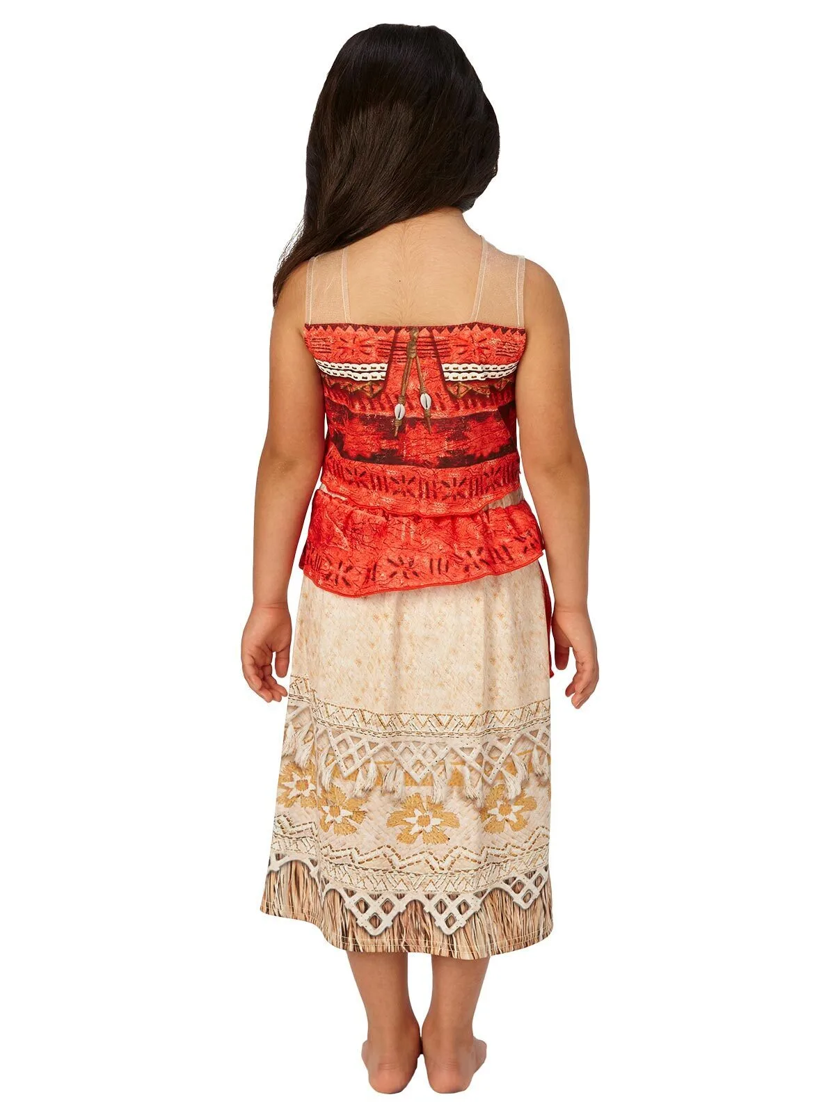 Available Online. For instore availability please call us on 07 3279 1555 Â A modern-day Disney Princess and star of the blockbuster 2016 movie “Moana”, this Polynesian Princess is brave, unfearing and determined. Along-side demi-god Maui they travel the seas in search of the Heart of Te Fiti, an ancient gem belonging to the living mother island. Made famous by the theme song ??How Far I’ll Go??, this delightful movie has inspired girls all over the world.INCLUDESDress with two layered printed polyester bodice with scalloped edge and tulle layer at belly connecting to skirtIllusion neckline in tulle with printed necklace and 3D necklace pendantDigitally printed skirt with two layers, top layer with shaped hem, plus digitally printed attached waist sash with removable tieFoam flower headpieceThis is an officially licensed Disney product