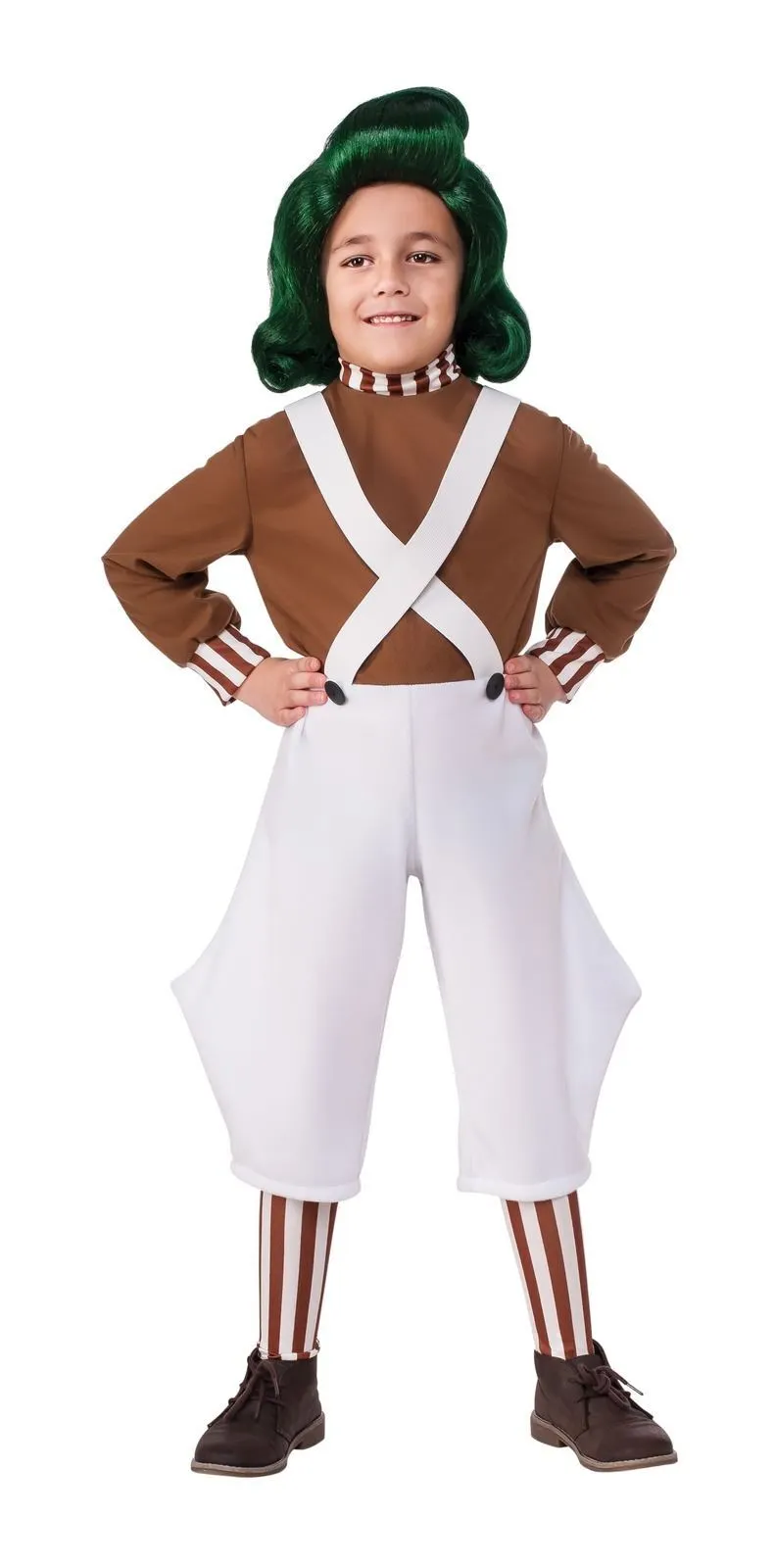 Available Online. For instore availability please call us on 07 3279 1555 Orange bodies, short stature and wild green hair – who else but the cute and very busy little Oompa Loompas, from the classic novel “Charlie and the Chocolate Factory”, by Roald Dahl in 1964. Saved from Loompa-land by Willy Wonka, these diligent little people love to sing and dance while they work, making the most delicious Wonka bars and many other delightful confectioneries. They are the sweetest choice for your next dress-up day or Book Week, but you will need to learn the words to their catchy song Oompa Loompa Doompa Dee Doo! INCLUDES Plush felted all-in-one jumpsuit with attached shaped pantaloons, cross over suspenders/braces and brown high collar bodice. Two large buttons on the front are sewn into the waistline Polyester striped leg pieces are open at the ankle and sit to just above the knee Wig sold separately – item code 32988 Shoes not included This is an officially licensed Willy Wonka And The Chocolate Factory product