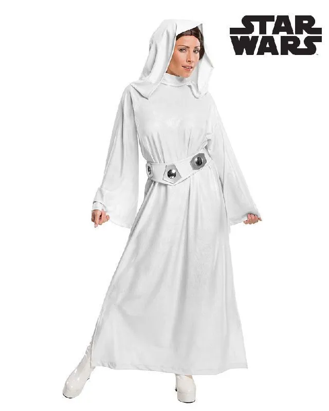 Available Online. For instore availability please call us on 07 3279 1555 Â Become the Rebel Alliance’s Greatest Leader. Fearless and strong, she, along with friends like Han Solo and brother Luke Skywalker bring down the Death Star in the famous Lucas Film and Disney Star Wars series. Played by the iconic Carrie Fisher, Princess Leia Organa appears in Star Wars: A New Hope (1977), The Empire Strikes Back (1980), Return of the Jedi (1983), Revenge of the Sith (2005), The Clone Wars (2008), Star Wars: Rebels (2014), The Force Awakens (2015), Rogue One (2016) and The last Jedi (2017). She is known for her trademark long white dress and immaculate plaited hair buns. This woman is a heroine of all the Galaxies as she fights like a Jedi with her lightsaber. Dressed as Princess Leia, you know the force will always be with you. INCLUDES Long white hooded dress in polyester with stand away collar and full length trumpet sleeves Moulded belt with painted features and tie at back Wig with brown strand and buns styling. Hair strand made of polypropylene, fabric content polyester White boots not included This is an officially licensed Star Wars product