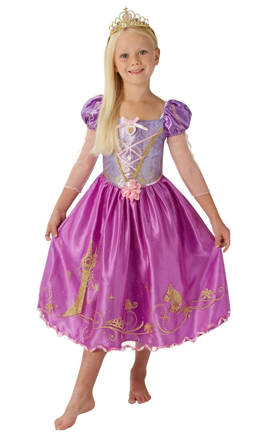 Available Online. For instore availability please call us on 07 3279 1555 Â “Rapunzel, Rapunzel, let down your hair!” beckons Huntsman Flynn Ryder. The Princess of Disney’s classic film “Tangled” (2010) with the famous long blonde, magical hair, Rapunzel’s story was inspired by the beautiful fairy tale from the Brothers Grimm. With chameleon friend Pascal by her side, she is locked in Mother Gothel’s secluded tower, awaiting her freedom. And along rides the rugged Eugene on his side-kick horse Maximus, to wins the heart of the golden Princess.INCLUDESDress with satin bodice and glitter print motifs, ribbon crossovers plus braid trim and satin flower embellishment at waistSatin puff sleeves with glitter stripes and tulle 3/4 lengthHeart shaped character pendant with satin bow at neckline. Satin skirt with a glitter printed tulle overlay and satin spiral hem. Satin peplum shaped with stitchingTiara with plastic jewels and love heart character printThis is an officially licensed Disney product