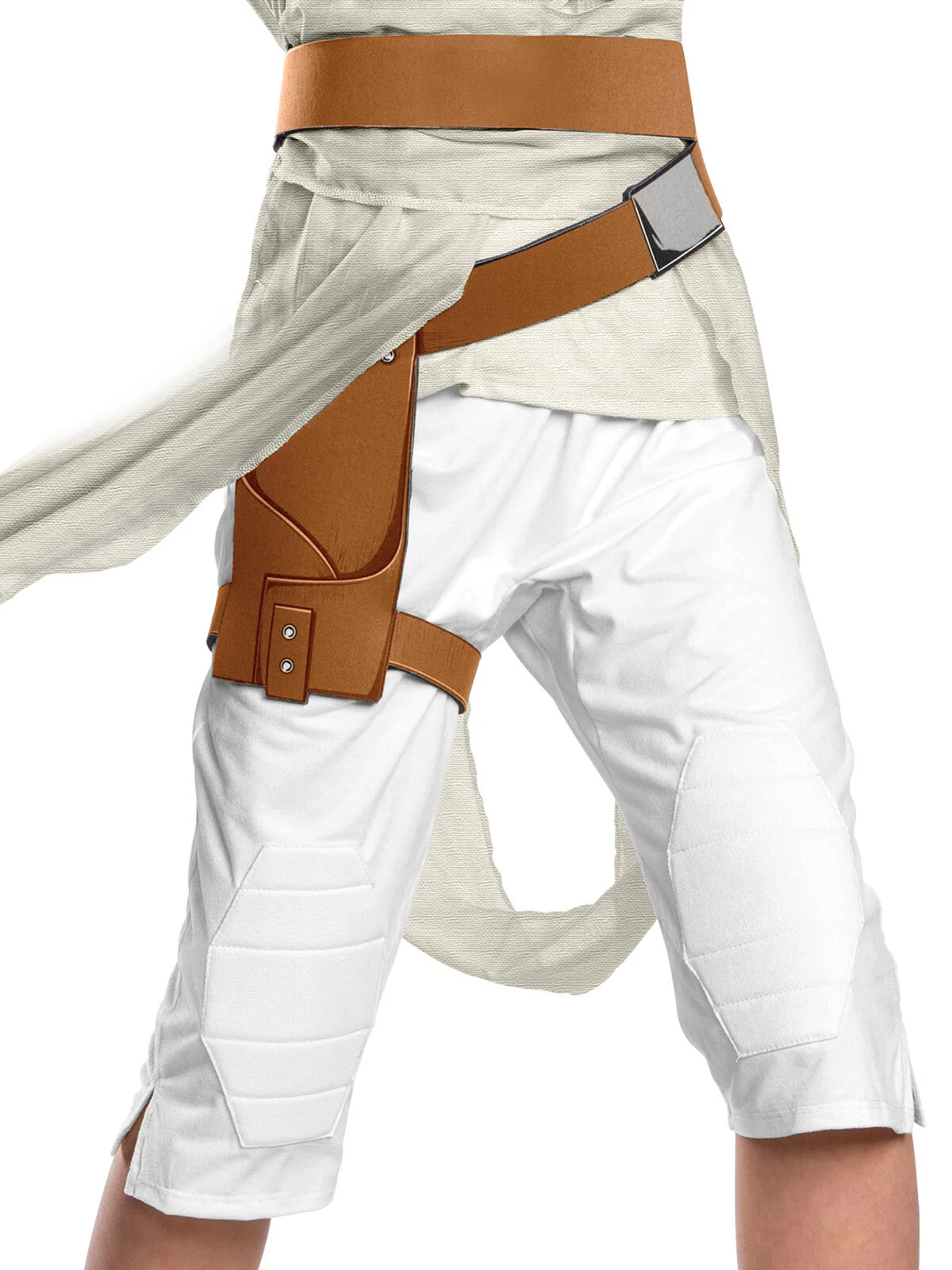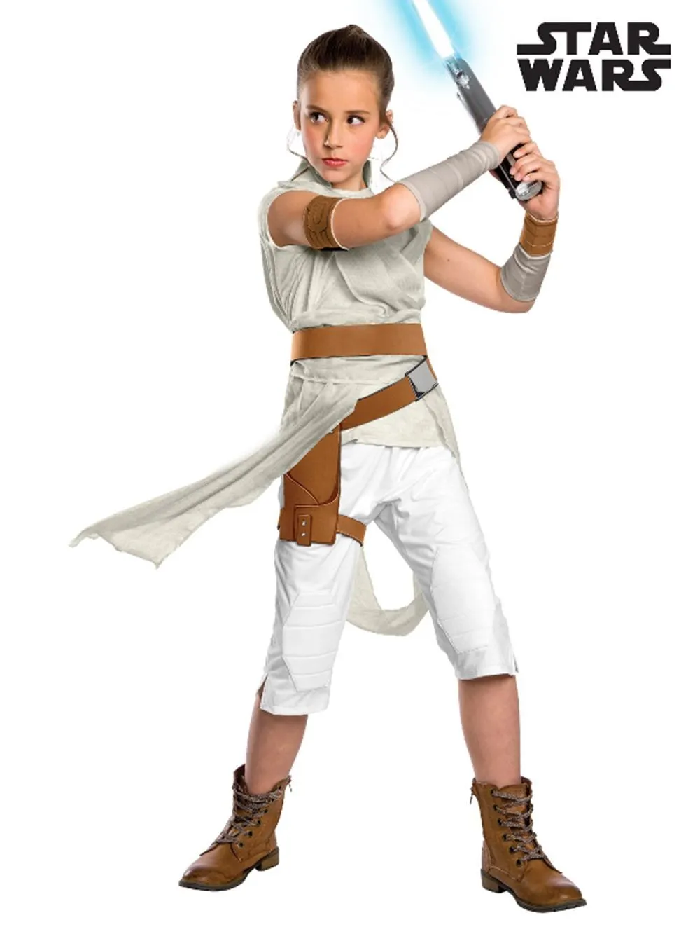 Available Online. For instore availability please call us on 07 3279 1555 Â Are you stubborn, headstrong, brave, optimistic and fiercely loyal to your friends? Then you could be Rey, the Jedi heroine and protagonist in Disney’s films Star Wars: The Force Awakens (2015), The Last Jedi (2017) and the latest Star Wars movie The Rise of Skywalker (2019). Played by Daisy Ridley, Rey starts out as a scavenger on the planet Jakku but with the help of friends BB-8, Finn and Poe, she becomes the ultimate Jedi, who wields her lightsaber and uses The Force to help save the galaxy from the First Order. What will she do in the 9th episode of the epic Star Wars journey? INCLUDES Sleeveless and hooded brushed suede tunic with polyester gauze wraps sewn into shoulders and waist White shorts in suede fabric with foam backed knee padding in textured fabric plus elastic at waist Foam backed double belt in faux leather with printed details including pouch with velcro fasten at back One Gauntlet is textured fabric with attached leather-look wrist guard and the other gauntlet is fabric with printed details Foam backed upper arm cuff with printed detail and velcro fasten. Boots and light saber not included This is an officially licensed Star Wars product