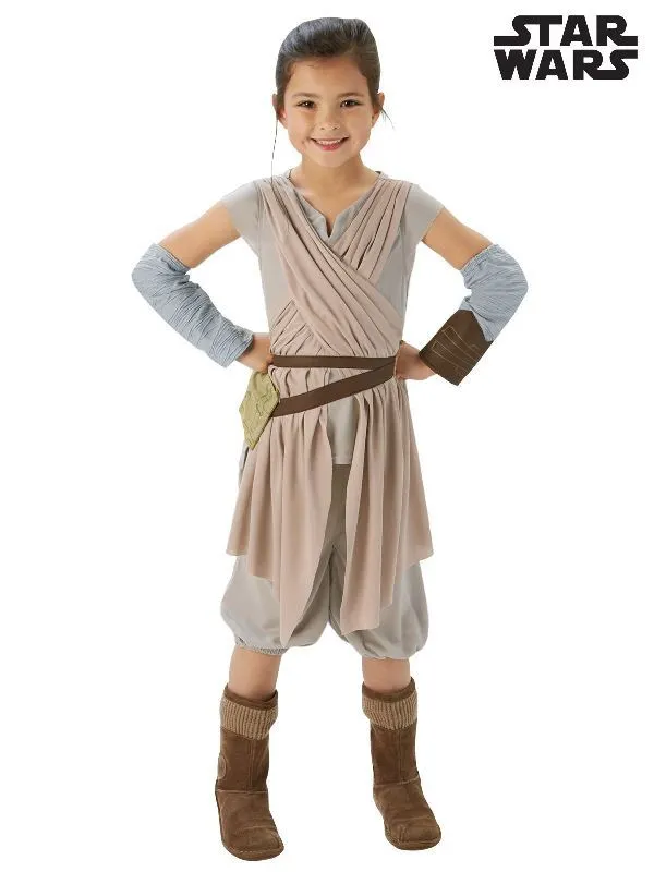Available Online. For instore availability please call us on 07 3279 1555 Â Are you stubborn, headstrong, brave, optimistic and fiercely loyal to your friends? Then you could be Rey, the Jedi heroine and protagonist in Disney’s films Star Wars: The Force Awakens (2015) and The Last Jedi (2017). Played by Daisy Ridley, Rey starts out as a scavenger on the planet Jakku but with the help of friends BB-8, Finn and Poe, she becomes the ultimate Jedi, who wields her lightsaber and uses The Force to help save the galaxy from the First Order. INCLUDES Tunic with attached sashes at shoulders and sewn in double belt Shorts with elastic at waist and knees Gauntlets in textured fabric with printed faux leather piece on left gauntlet Detachable pouch with printed features and velcro fasten. Boots not included This is an officially licensed Star Wars product