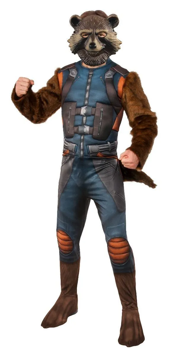 Available Online. For instore availability please call us on 07 3279 1555 Â He is the super cool Rocket Raccoon! A genetically and cybernetically enhanced raccoon, also called a rat, rodent, rabbit – there are many nicknames for this outer-space Raccoon! Bradley Cooper dons the whiskers and tail to become Rocket in the Marvel Cinematic Universe films like “Guardians of the Galaxy” volumes one and two and “Avengers: Infinity War” (2018). Join him in his adventures with space heroes Drax, Star-Lord, Gamora and Groot.INCLUDESJumpsuit with digitally printed bodice and fibre filled with stitching details plus full length sleeves in faux fur fabricPants with digital print plus attached boot topsFaux fur tail attachedMoulded mask with painted details elastic band with velcro fastenThis is an officially licensed Marvel product