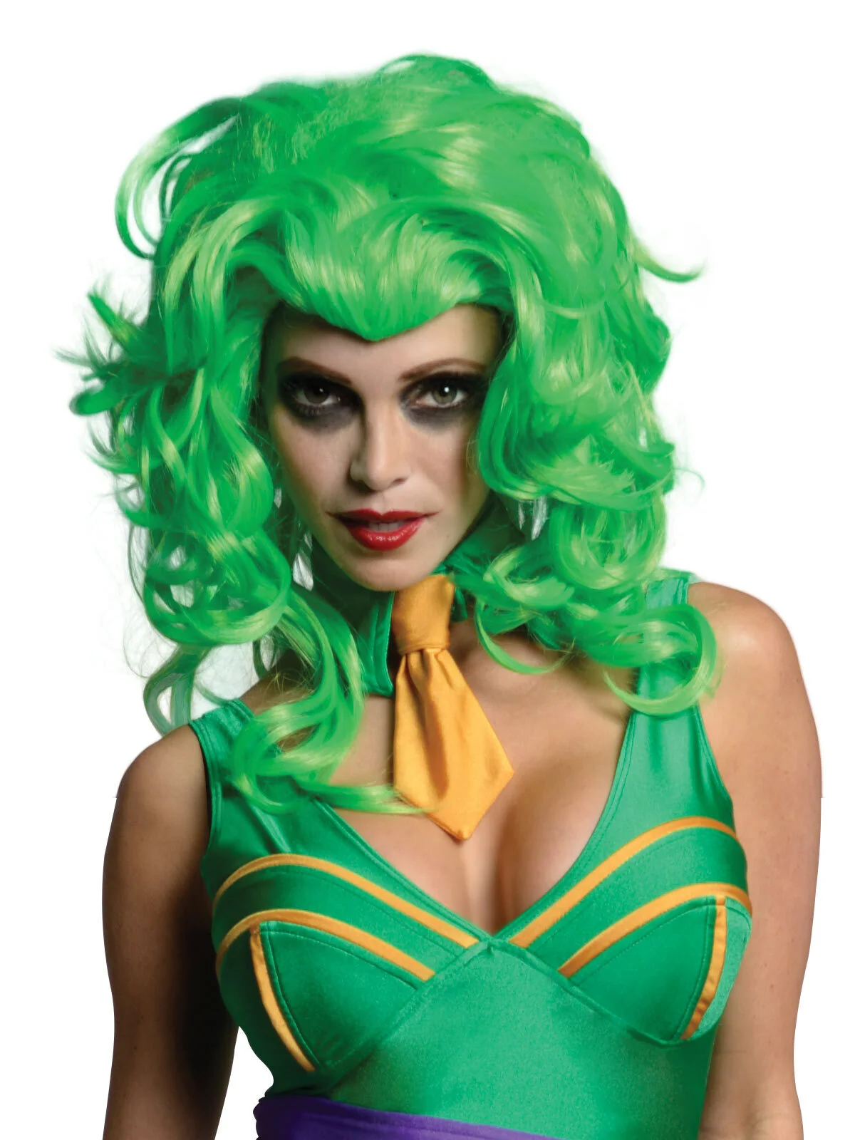 Available Online. For instore availability please call us on 07 3279 1555 Â A criminal master-mind and possibly one of the most infamous supervillains in the DC Comics universe, The Joker – the smiling assassin – is arch-nemesis of Batman and nearly all DC Comics superheroes. He stars in comic books, films and TV series, always wearing his painted red smile to hide his damaged face beneath, wild green hair and purple suit. Resident psychopath of Gotham City, The Joker has been played by various actors in TV series and many Warner Bros movies over the decades. Actors like Jack Nicholson and Heath Ledger have taken this crazed character to new heights of stardom. With a sadistic sense of humour, the “man who laughs” does not always get the last laugh against true heroes like the Great Batman. See The Joker play his deck of cards in films like Batman Begins (2005), Brave and Bold (2008), The Dark Knight (2008) and Suicide Squad (2016).INCLUDESBody con dress with orange stripes on the bustier and attached belt with bucklescollar with attached mini tie and velcro fastenWrist length white glovesWig with curly green hair, made of polyproylene strands and polyester fabricThis is an officially licensed DC Comics product