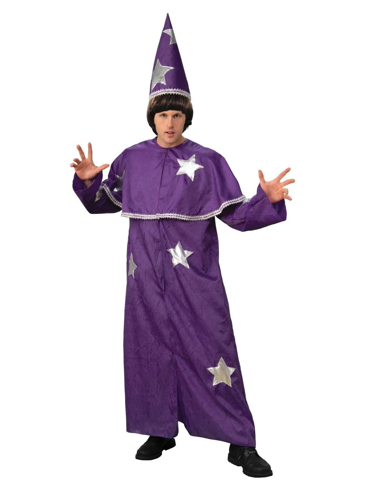 Available Online. For instore availability please call us on 07 3279 1555 Â Are you into American Sci-Fi and horror? Well step back to the 1980s in Hawkins, Indiana and be set to scream! With an investigation into the disappearance of a young boy and supernatural events occurring around town, Hawkins is awakened into a series of eerie and abnormal occurrences. Join the upside-down world and play some Dungeon and Dragons as Will the Wise Wizard. Just beware of any shadow monsters living inside of you! INCLUDES Full-length purple robe in polyester with digitally printed silver stars throughout Robe has a yoke attached at the collar and full-length sleeves Pointed foam-backed wizard hat in matching colours with sliver rim and stars Shoes not included This is an officially licensed Stranger Things product