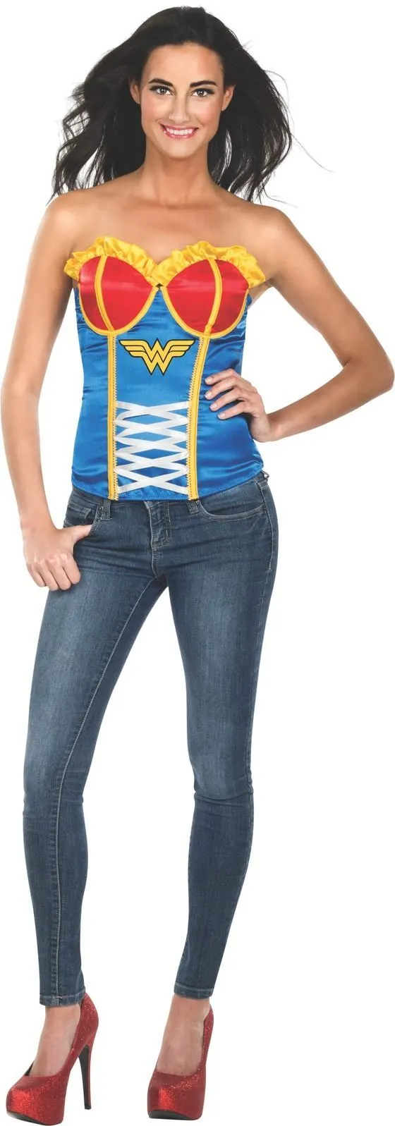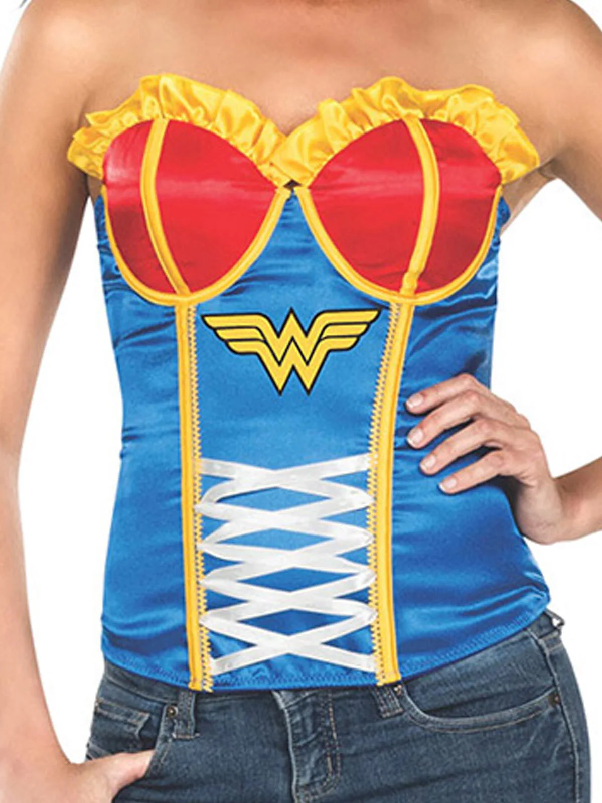 Available Online. For instore availability please call us on 07 3279 1555 Â Wonder Woman is Princess Diana of Themyscira, but she adopts the civilian identity of Diana Prince in daily life. The DC Super-heroine from the Amazonian Jungle, she has super human strength and speed, and uses trusty weapons like her lasso of truth, her tiara and bullet-proof bracelets. She teams up with fellow heroes like Batman and Superman as part of the Justice League and takes on crime wherever it lurks. Portrayed as strong, sexy and smart, Wonder Woman has appeared in many Warner Bros movies as well as cartoons, TV series and video games. She is also a team member of the DC Superhero Girls along-side Batgirl, Supergirl and Harley Quinn. From the days of Lynda Carter on the small screen to Gal Gadot on the big screen in Batman Vs Superman: Dawn of Justice (2016), Wonder Woman (2017) and Justice League (2017).INCLUDESSatin corset with boning down bodice frontSatin frill over sweetheart necklineRibbon crossover detail on front middle panelPrinted Wonder Woman emblem under bustierThis is an officially licensed DC Comics product