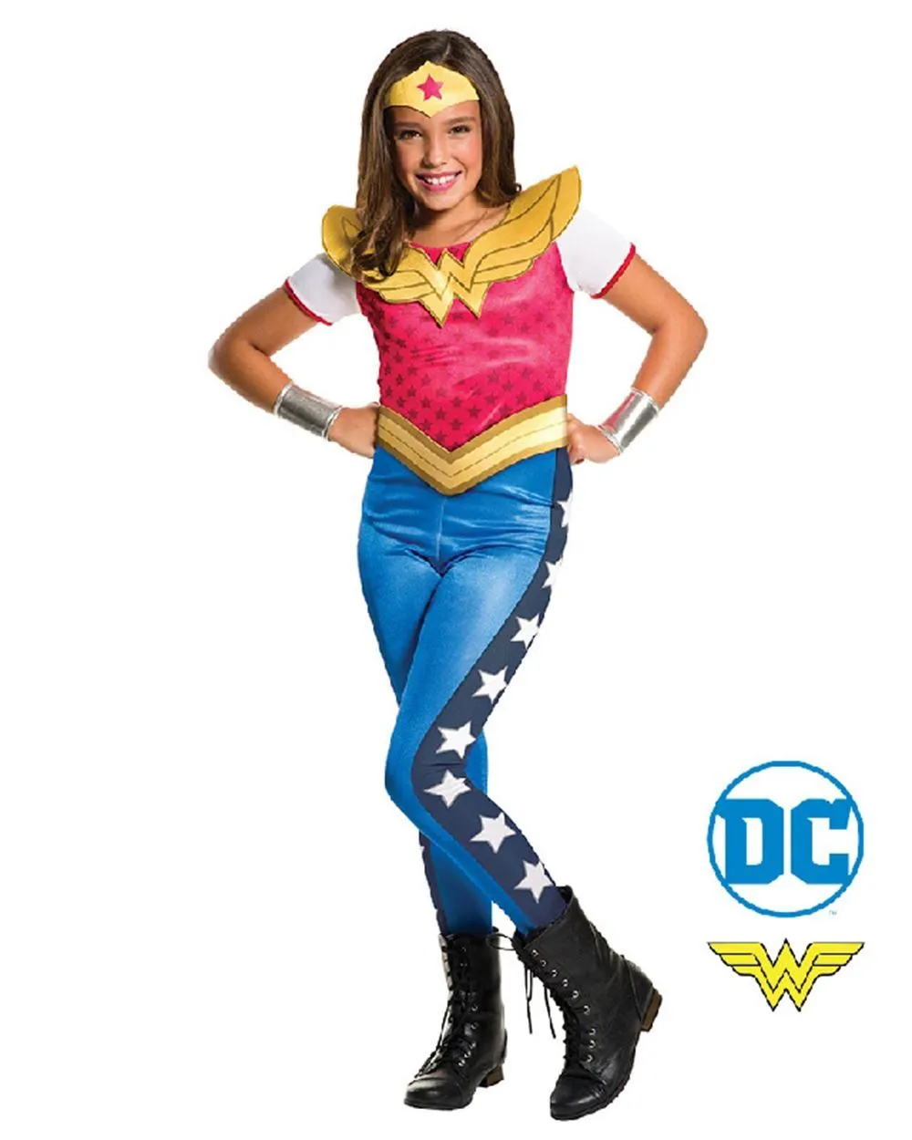 Available Online. For instore availability please call us on 07 3279 1555 Â Wonder Woman is Princess Diana of Themyscira, but she adopts the civilian identity of Diana Prince in daily life. The DC Super-heroine from the Amazonian Jungle, she has super human strength and speed, and uses trusty weapons like her lasso of truth, her tiara and bullet-proof bracelets. She teams up with fellow heroes like Batman and Superman as part of the Justice League and takes on crime wherever it lurks. Portrayed as strong, sexy and smart, Wonder Woman has appeared in many Warner Bros movies as well as cartoons, TV series and video games. She is also a team member of the DC Superhero Girls along-side Batgirl, Supergirl and Harley Quinn. From the days of Lynda Carter on the small screen to Gal Gadot on the big screen in Batman Vs Superman: Dawn of Justice (2016), Wonder Woman (2017) and Justice League (2017). INCLUDES Jumpsuit with digitally printed star pattern on bodice, collar in logo shape and short sleeves with contrast edge Pants with printed detail including stars and stripe Shaped belt with printed details and velcro fasten plus metallic gauntlets Shaped headpiece and printed star and elastic strap with velcro fasten This is an officially licensed DC Comics product