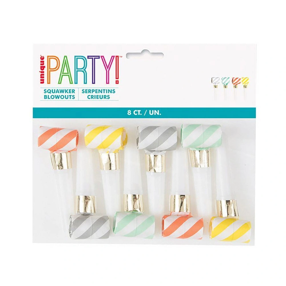 Includes 8 Striped Squawker Blowouts Assorted Colours High Quality The perfect accessory for your theme parties Coordinate with another party accessory and party decorations to complete your party